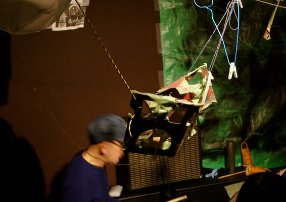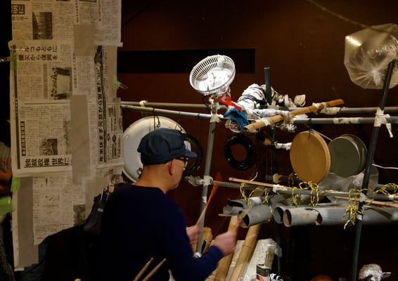 タイヤ、塩ビ管、ひも、新聞紙、洗濯バサミ、発泡スチロール、レジャーシート、下駄、木魚